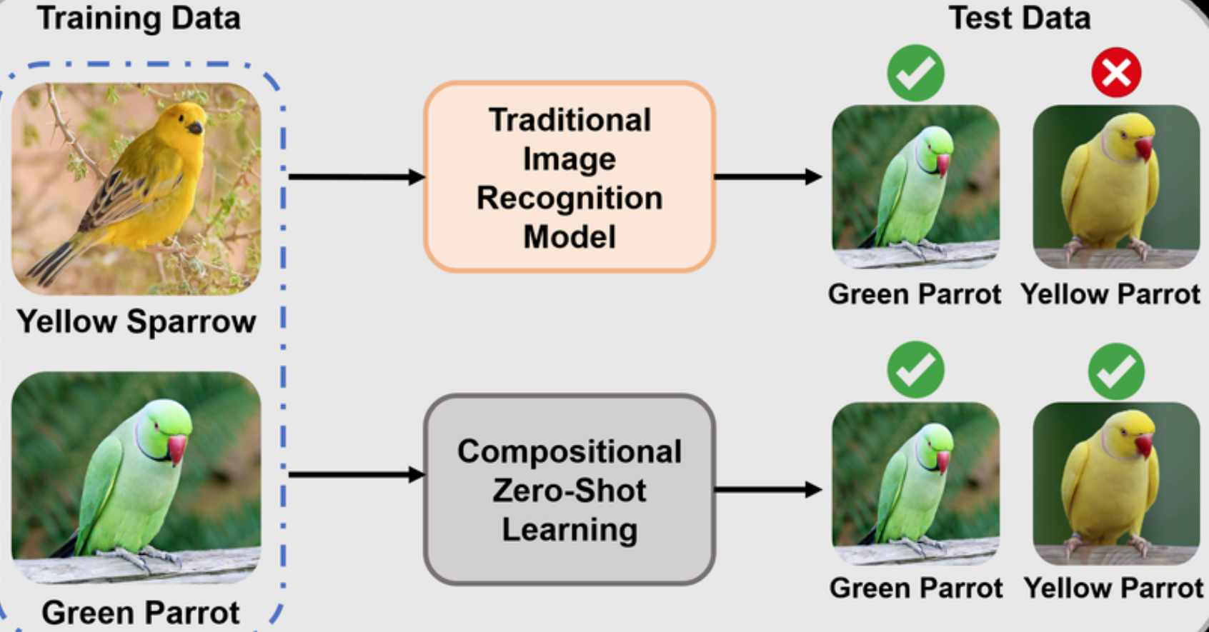 - 测试阶段要识别未见过的新组合(如训练见过