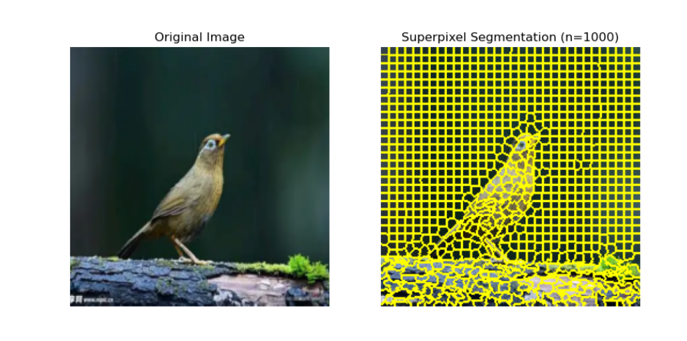 n_segments=100时分块很粗,适合看整体结构;n_segments=1000时边界明显更贴局部轮廓;- 继续增大分块数时,细节会更完整,但抗噪能力会下降。